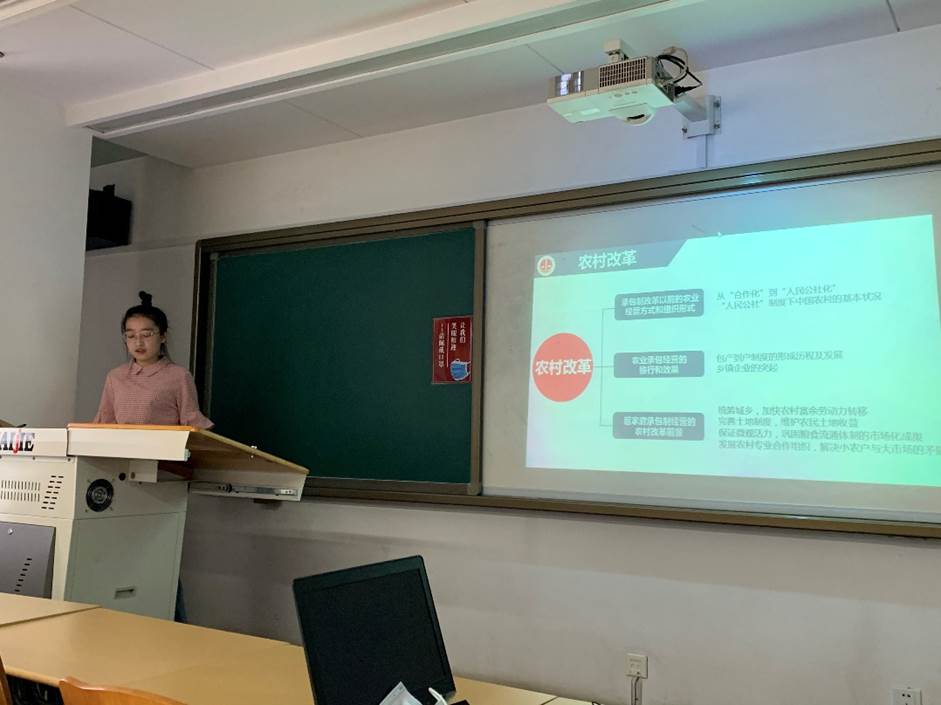 赵宇萱同学介绍了我国的农村改革和国有企业改革。她提出,从整体现代化进程上看,农村经济的改革为社会发展提供了可靠的基石,对更大范围的经济改革产生了示范效应,例如国有企业、财政金融等领域的改革也从农村经济改革中获取了经验和启发,取得了显著成效。