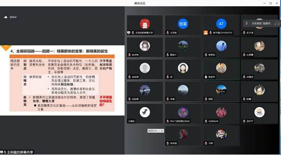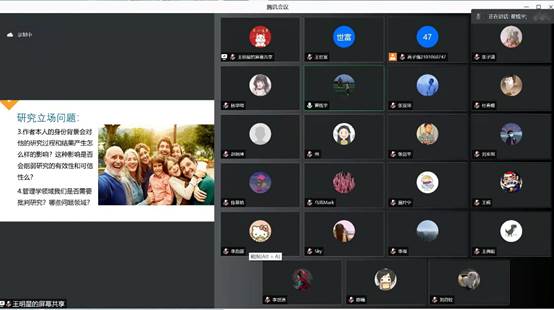 公司工商管理系、工商管理党支部研究生第23期读书研讨会于2021年11月8日上午在线上顺利举行。本次读书会由张亚琼老师主持,2020级企业管理专业硕士生王明星同学主讲。参与本次读书会的有工商管理系郭颖老师、慕凤丽老师、陈曦老师、马克态老师、邵开愚老师、李璨老师、王尧老师、王辉老师、张亚琼老师及2020级、2021级企业管理专业全体研究生,大家围绕邵开愚老师推荐的《特权:圣保罗中学精英教育的幕后》一书的内容及相关问题展开了讨论。