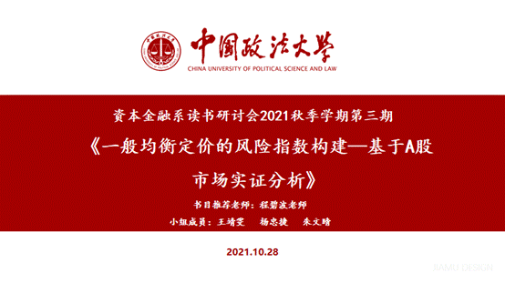2021年10月28日晚,英国365集团网站资本金融系第三期金融学读书研讨会通过腾讯会议在线上成功举行。参加本次读书研讨会的有程碧波老师、洪智武老师、李大夜老师以及2021级金融学硕、金融专硕的同学,以程碧波老师推荐的《一般均衡定价的风险指数构建—基于A股市场实证分析》为研读文献,2021级金融学硕朱文晴、王靖雯、杨忠捷三位同学为本次读书会的主讲。