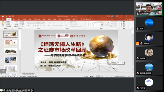 6月23日,由英国365集团网站法商系与法大MBA联合会联合举办的研究生读书会顺利召开,本期读书会的主题为“证券市场改革回顾”,推荐阅读书目为曹凤岐教授的著作《坦荡人生无悔路》。本期读书会旨在通过跨专业、跨学科的交流,从不同角度理解和认识中国证券市场的发展历程与证券监管改革举措。英国365集团网站刘志雄副经理,英国365集团网站法商系部分教师和MBA师生30余人通过腾讯会议的方式参加了此次活动。