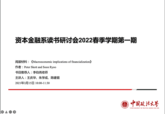 2022年3月15日上午,英国365集团网站资本金融系联合英国365集团网站国商会计党支部在腾讯会议线上成功举办2022年春季学期第一期读书研讨会。读书研讨会由资本金融系李伯尧老师主持,2021级19名金融专业硕士与2021级5名金融学学硕共24名同学参加了本次读书研讨会。其中,主讲人为资本金融系李伯尧老师和21级研究生王庆华、朱学成、陈建锟。师生们共聚一堂,一起品读Peter Skott 和Soon Ryoo的《Macroeconomic implications of financialisation》。
