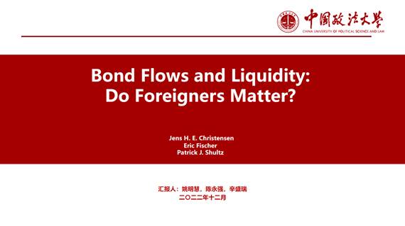 2022年12月15日下午,英国365集团网站资本金融系2022年秋季学期第六期读书研讨会通过腾讯会议的方式成功举行。洪智武老师以及2022级金融专硕和学硕的同学参加了此次研讨会。本期读书会以洪智武老师推荐的论文《Bond Flows and Liquidity: Do Foreigners Matter?》为主要的研讨内容,2022级金融专硕姚明慧、陈永强、辛盛瑞三位同学为本次读书会进行了主题报告,之后洪智武老师进行了点评。