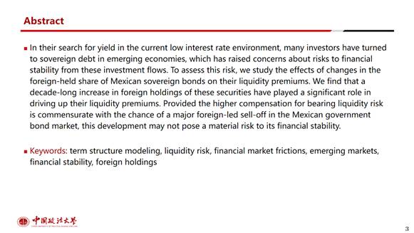 姚明慧同学先为大家讲解了这篇论文的引言和文献综述部分。在2008-2009年全球金融危机以来的10年里,发达国家的利率水平普遍下降,促使全球投资者追求更高收益率,并大幅增加了在新兴经济体政府债券的持有量。这些现象意味着外国债券突然停止流入这些市场的可能性加大了,一旦发生,这将会带来极高的经济损失。因此,有必要分析这些新兴市场国家的债券外国持有量、债券市场功能与国内政府债券市场的金融稳定性之间的关系。为了评估新兴经济体中外国参与主权债务市场的增加对金融稳定的潜在影响,本文分析了外国投资者在一个主要的新兴市场经济体,即墨西哥,对国内政府债券流动性溢价的影响。