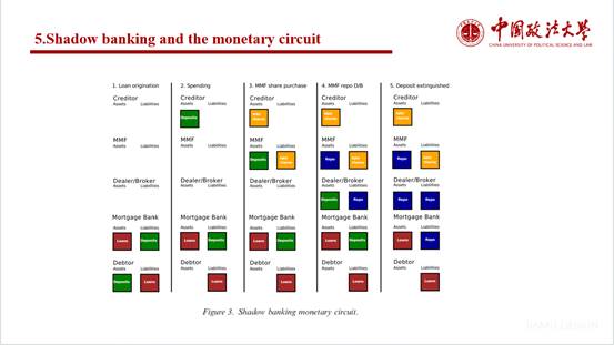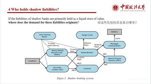 接下来,廖韬同学介绍了本文的理论分析过程,包括货币的等级制度,以及影子银行系统在经济体中的地位。作者根据货币在循环体系中行使的不同职能,在文章中确立了货币的等级制度:在商品、服务进行结算时,通常可以用流通性更高的货币进行最终结算,却无法利用低流动性的资产进行结算。如票据到期时,可以通过银行存款、现金方式结算,而银行活期存款提取时,却无法通过支付商业票据的形式进行结算。正是这种结算功能的不对称建立了货币等级制度。进一步的,本文清晰展示了影子银行体系,在该体系中,存在于最终债权人与最终债务人资金链条间的中介机构数量多与传统银行体系,各主体间的资产负债表联系密切,因而也使不稳定性被放大。