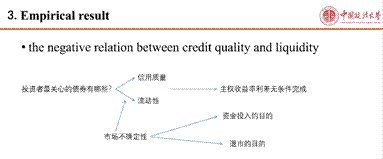 之后聂同学以一个流程图简洁表明了投资者最关心的债券属性,并且在市场不确定性加剧的影响下,投资者对质量还是流动性的选择,最后,将这两个角度结合在一起,通过将收益率利差精确地划分为信贷和流动性成分。