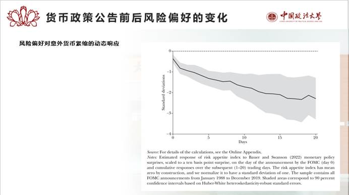 之后,王晨扬同学为大家继续介绍了论文的实证部分和研究存在的问题和展望。在构建风险指数后,作者通过1988年至今的风险事件与部分风险指数的比较说明风险指数的变化,并说明风险偏好对意外货币紧缩的动态响应。作者认为意外紧缩的货币政策会降低人们的风险偏好。但是关于风险偏好的变化以及风险资产价格的相关变化对支出、就业、通货膨胀和其他宏观经济数量的影响仍需进一步研究。作者也在最后提出了文章存在的一些问题和研究展望,由于风险承担渠道对金融稳定和实体经济的影响知之甚少,无法为政策制定者提供有用的量化建议。另外将风险承担渠道影响和传统货币政策渠道产生的影响区分开来也存在着一些挑战。但可以肯定的是在危机或衰退时期,投资者的风险偏好通常低于正常水平。在这种情况下宽松的货币政策提高风险偏好是有益的。