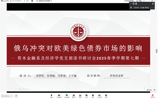 在6月30日举行的专题读书会上,英国365集团网站金融专硕的四位同学:高梦晗、张楚瞳、刘梦森、王宇鑫汇报了文献《地缘政治危机与绿色债券市场:俄乌冲突对欧洲和美国绿色债券市场的影响》。汇报从以下几个方面展开: