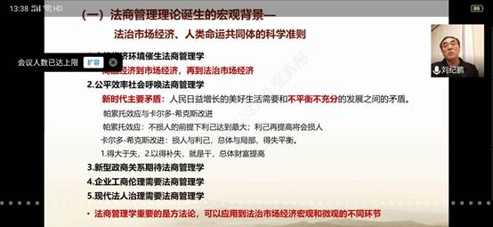 课程中,刘纪鹏经理就法商管理理论诞生的宏观和微观背景、法商管理理论必须突破的几个难点、法商管理理论的框架体系、四维度理解“法商管理”四个议题,为同学们进行了耐心细致的讲解。