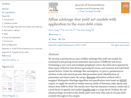 近日,公司资本金融系教师洪智武以第一作者身份在期刊《Journal of Econometrics》在线发表题为《Affine arbitrage-free yield net models with application to the euro debt crisis》的学术论文。该文章提出了用于不同期限和不同风险的债券定价的仿射无套利收益率网络模型。文章将多条收益率曲线分为中心曲线和周边曲线,并按照影响曲线的机制将定价因子分为三类:基础因子、共同因子(流动性风险和信用风险)和特质因子。该文在无套利的假设下证明了一个风险中性过程下的简约解,并使用了贝叶斯方法中的边缘Metropolis–Hastings算法和基于MCMC的模型设定检验,将该模型应用于2009年至2016年间的德国、意大利、西班牙和希腊的国债收益率曲线的建模分析,实证讨论了不同因子在收益率曲线变动中的作用,发现信用风险因子在利差中扮演水平因子的作用,流动性因子则扮演着斜率因子的作用。此外,该模型还可以用于重构收益率信息缺失的希腊收益率曲线。此前,洪智武分别在《经济研究》、《金融研究》、《Quantitative Finance》、《Economic Modelling》等国内外期刊发表重要成果。