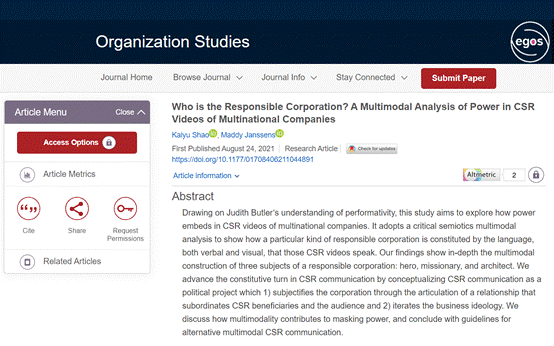 2.Kaiyu Shao*, Maddy Janssens. Who is the Responsible Corporation? A Multimodal Analysis of Power in CSR Videos of Multinational Companies. Organization Studies, 2021, https://doi.org/10.1177/01708406211044891.