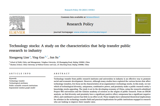 1.Xiangpeng Lian, Ying Guo*, Jun Su. Technology Stocks: A Study on the Characteristics that Help Transfer Public Research to Industry. Research Policy, 2021, https://doi.org/10.1016/j.respol.2021.104361.