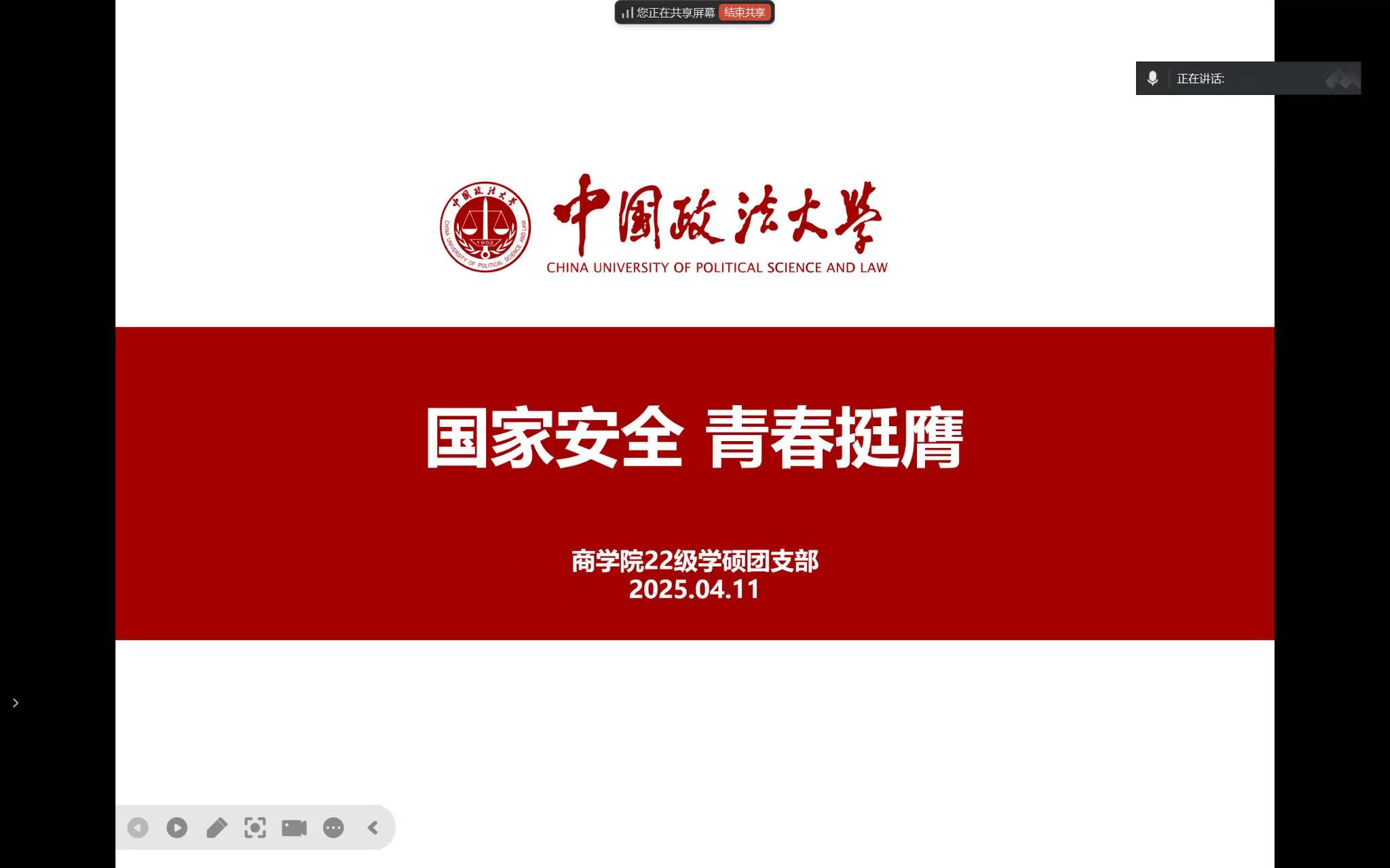 通过PPT讲解、视频观摩及简短交流发言的形式,本次团日活动使22级学术硕士团支部全体团员深入领会了国家安全之核心以及新时代国家安全工作取得的重大成就,有效深化了团员青年的国家安全意识。通过理论与案例相结合的讲解方式,既激发了青年学子的爱国情怀,又引导大家思考如何立足专业特长,为维护国家安全贡献智慧力量。